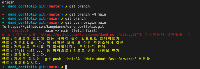 4. 나는 로컬에서 main 이름으로 push하면 없는 브랜치라는 알림의 반복