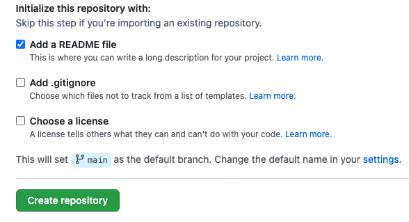 Github에서 새 repository를 생성하면 기본 브랜치 이름이 main으로 설정된다.